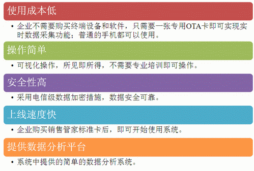 因为各家企业的数据采集需求不同,需要根据各家企业的需要定制不同的OTA卡,相应的增加了 投入成本。为节省开发成本,让企业快捷方便的使用OTA方案,联通公司推出了销售管家标准卡。我们公司开发了销售管家标准应用平台,可以实现OTA软件开发、 数据统计分析等功能。