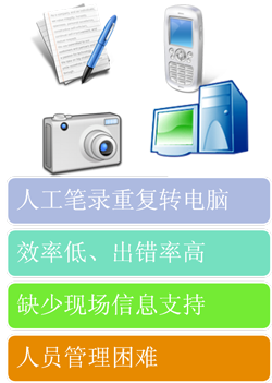 1、 工作量大、效率低 烟草客户经理和稽查人员的服务职能越是凸显其重要性,对零售户的服务力度越是大,工作量也就越加的大,不仅仅需要指导经营、宣传政策,更加是要采集零售户多种信息如销售、库存、评分等数据,以备后台程序统计分析,供营销、专卖等部门决策分析,通常在没有设备的情况下工作人员只能通过手工方式记录各种信息,效率极其低下。
